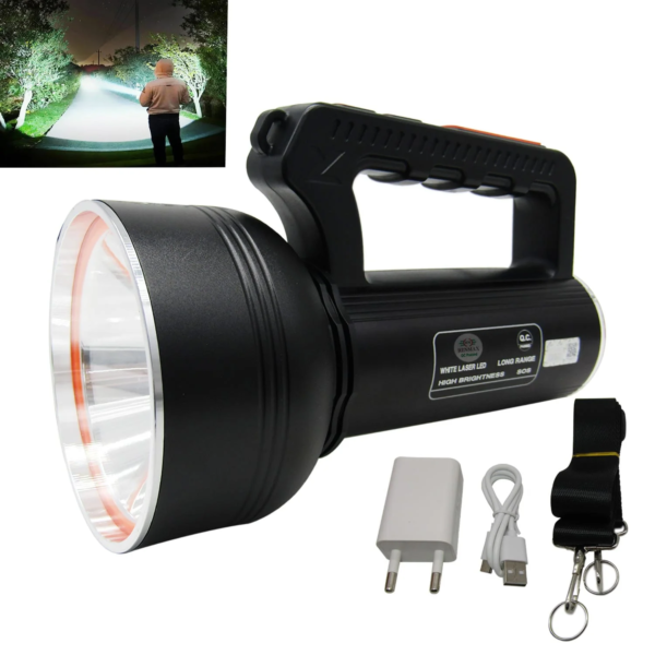 Shop wide range of collection of hand Torch and Emergency Lights from the house of RENMAX. Very High Bright LED Torch Light Long beam range of 2km, 350 watt suitable for Security, search, tactical, Fishing, camping, SOS Emergency, farming, hiking, car safety etc. Torch has waterproof design with Metal Housing and plastic handle for convenient holding. It comes with USb Charger and a C-Type USB cable for recharging. Shoulder Belt is also included in package. High/Low/Blinker main light modes. White Steady & Red-Blue Blinker Tail Light Modes. 18000mAh Maintenance free Powerful Li-ion Built-in Batteries enough to keep the torch bright for 5-6 hours in high brightness mode & up to 12 hours in Low light mode. It has USB port for Mobile charging as well. Dual Power Buttons for long life.